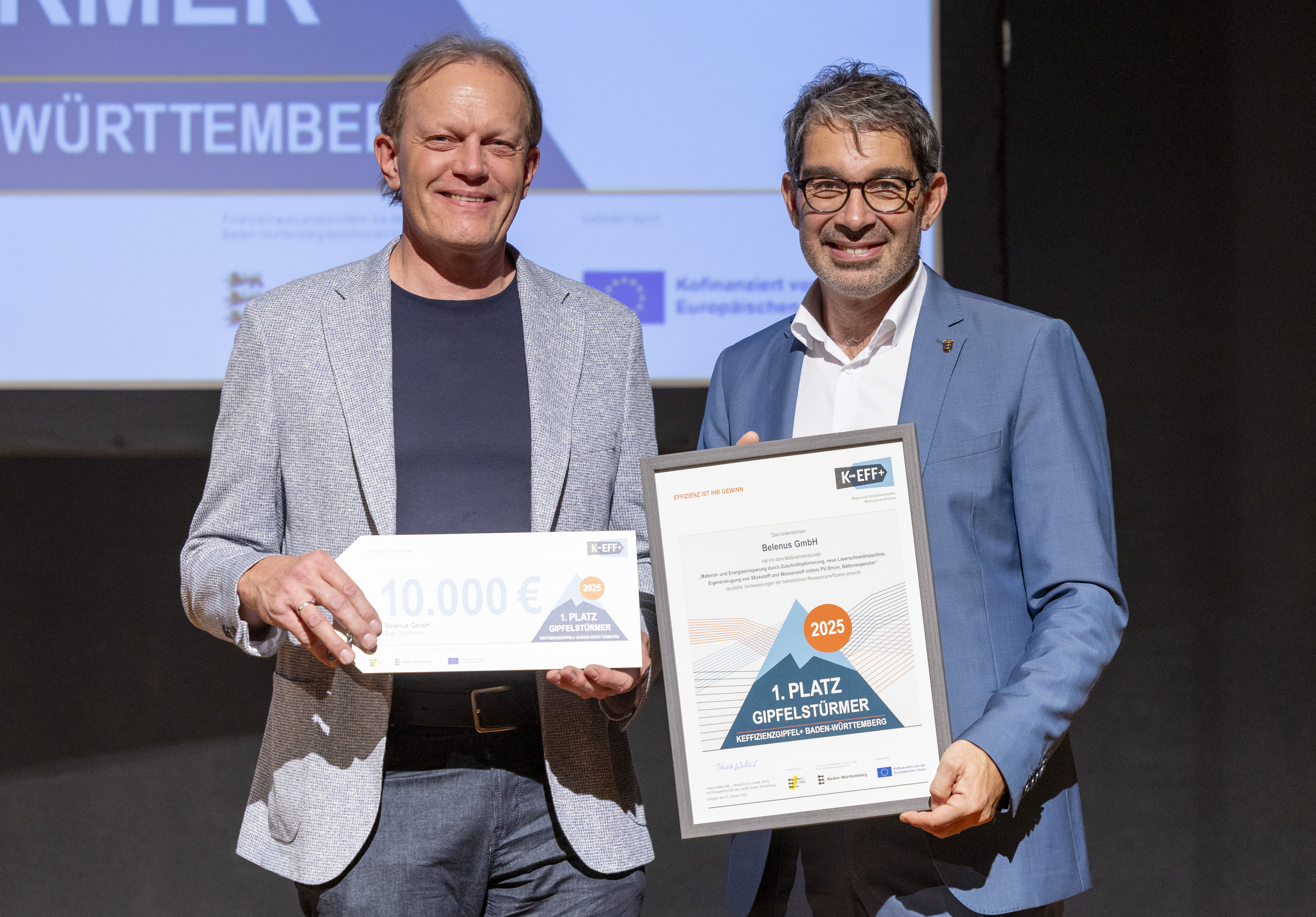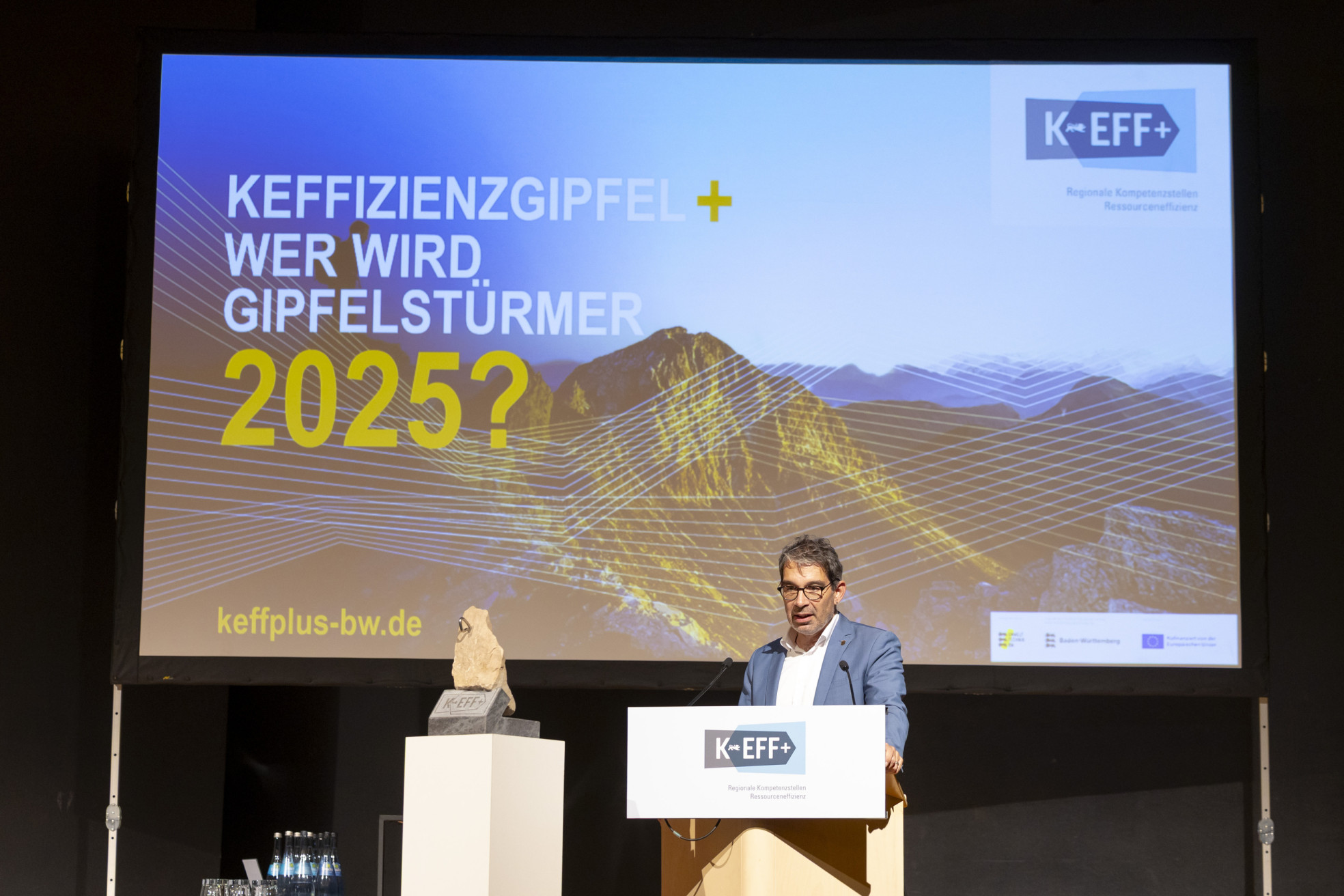 Stuttgart, 23. Oktober 2025 – Herausragende Leistungen baden-württembergischer Unternehmen standen beim KEFFIZIENZGIPFEL+ am 23. Oktober 2025 im Mittelpunkt. In der Liederhalle in Stuttgart hat Staatssekretär Dr. Andre Baumann feierlich den mit 10.000 Euro Preisgeld dotierten „Gipfelstürmer des Jahres“ für ausgeprägtes Engagement in Material- und Energieeffizienz verliehen. Mit dieser Auszeichnung würdigt das Ministerium für Umwelt, Klima und Energiewirtschaft Baden-Württemberg Unternehmen, die nach einem KEFF+Check Ressourceneffizienzmaßnahmen in vorbildlicher Form realisiert haben.