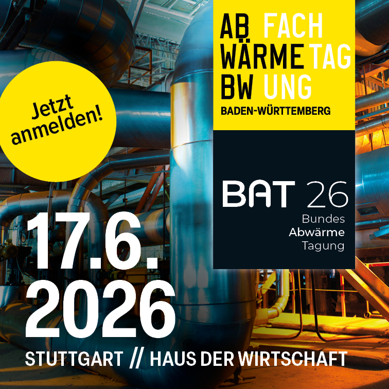 Am Mittwoch, 17. Juni 2026 steht im Haus der Wirtschaft in Stuttgart wie bei den erfolgreichen Einzelveranstaltungen in den Vorjahren die Abwärmenutzung in Unternehmen und Wärmenetzen in ihrer ganzen Bandbreite im Mittelpunkt. Die Kooperation mit der BAT26 macht die Tagung zu einem Fachevent der Superlative, das in dieser Form und in diesem Umfang zum ersten Mal in Deutschland stattfinden wird.